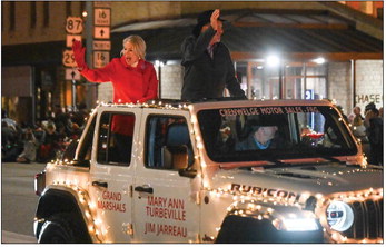 The Light the Night Christmas parade grand marshals Mary Ann Turbeville and Jim Jarreau wave...